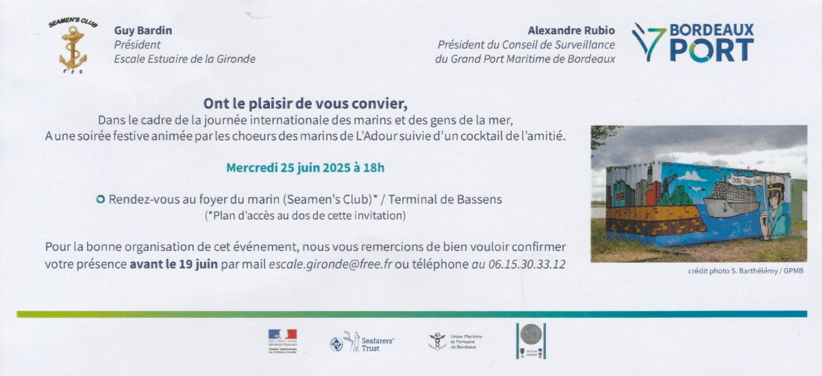 A l’initiative de Guy Bardin, président de l’association Escale Estuaire Gironde en charge de l’animation du foyer, et avec le soutien du Grand Port Maritime de Bordeaux, de l’Union Maritime et Portuaire de Bordeaux, du pilotage, de la Fédération du Mérite Maritime, cette soirée a été l’occasion de renforcer les liens entre tous ceux qui font vivre la communauté maritime, et de rendre un hommage aux marins, maillons indispensables du commerce et des échanges internationaux.