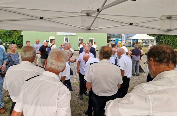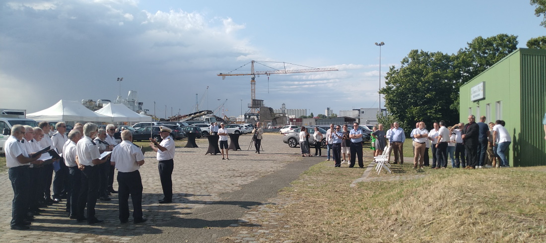 Animée par les chœurs des Marins de L’Adour, elle a rassemblé près de 80 personnes de la communauté maritime bordelaise, aux côtés de marins en escale ce jour-là au Port de Bordeaux.
