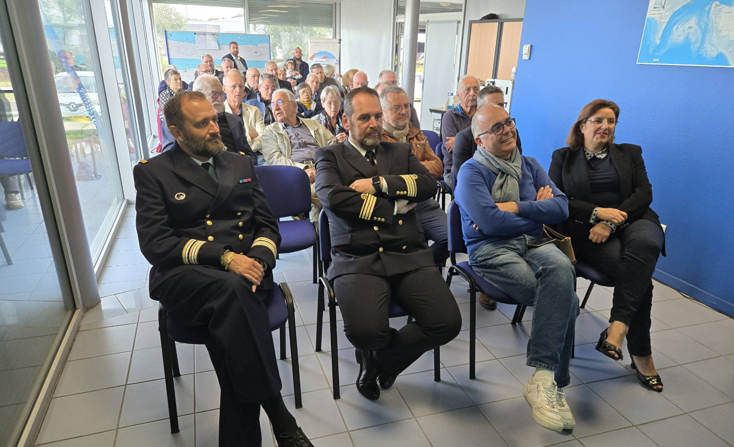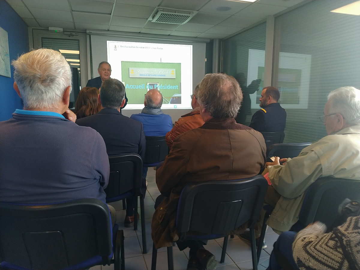 Mme Yasmina BOULTAM Conseillère Régionale, Mr Stéphane PERES DIT PEREY représentant Mr Jean TOUZEAU Maire de Lormont, le Cdt LIETARD représentant le Cdt SINQUIN, Commandant du port de Bordeaux, Mr Jean-Yves CARLIER, Directeur départemental adjoint délégué à la mer et au littoral, Mr Julien MAS, Président du Club Maritime (UMPB), Mr Francis LAVERRIÈRE Président du Mérite Maritime 33 et Mr Jean-Pierre TURON ancien Maire de Bassens, représentant son successeur Mr Alexandre RUBIO, aussi Président du conseil de surveillance du Grand Port Maritime de Bordeaux, entourés par les 32 adhérents présents, qui avec 40 autres ayant donné leur pouvoir, ont permis de valider le quorum pour notre Assemblée Générale Annuelle :